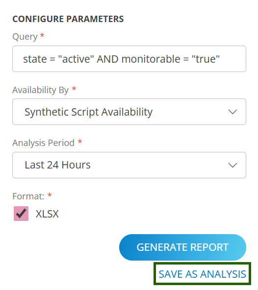 There is now a SAVE AS ANALYSIS button below the Generate Report button in the configuration parameters section of each reporting app. This new option will save an analysis before generating the on-demand report. This feature streamlines the workflow and reduces unnecessary clicks.